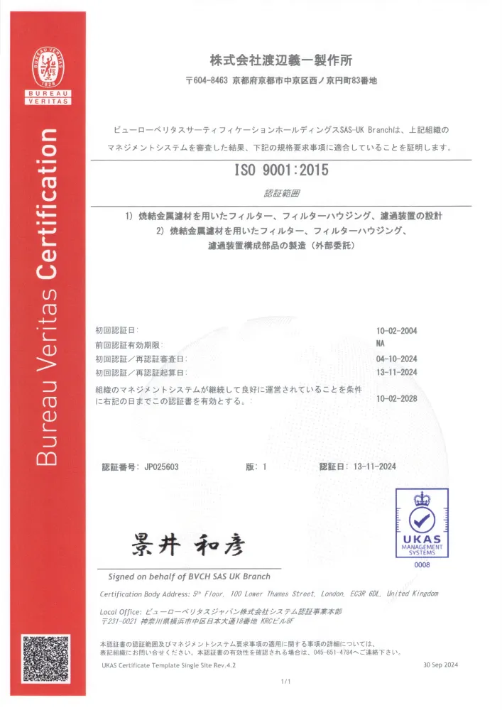 About Us 会社情報 濾過フィルターを通して世界の様々な分野において社会に貢献します。 トップメッセージ 理念 会社概要 会社沿革 事業内容 ISO 認証 事業所・施設関連 ISO認証 ISO認証取得への取り組み 以下がISO 取得に関する内容です。 ISO9001:2015 焼結金属濾材を用いたフィルター、フィルターハウジング、濾過装置の設計 焼結金属濾材を用いたフィルター、フィルターハウジング、濾過装置構成部品の製造(外部委託)