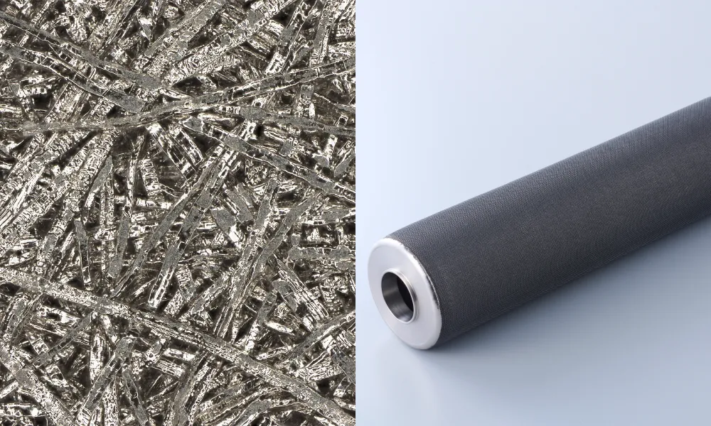 チタンファイバー焼結体を使用した100%チタン製フィルター。耐食性に優れ、海水や酸・アルカリにも強い構造です……