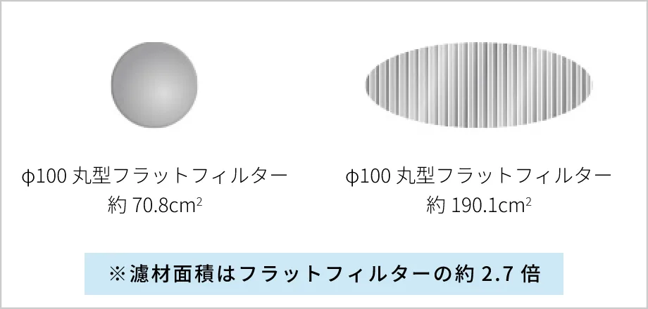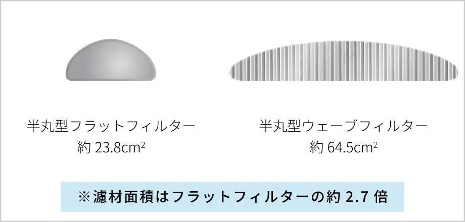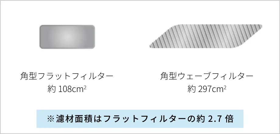 弊社がウェーブフィルターをお勧めする大きな利点は、フラットフィルターとの比較における表面積の違いにあります。