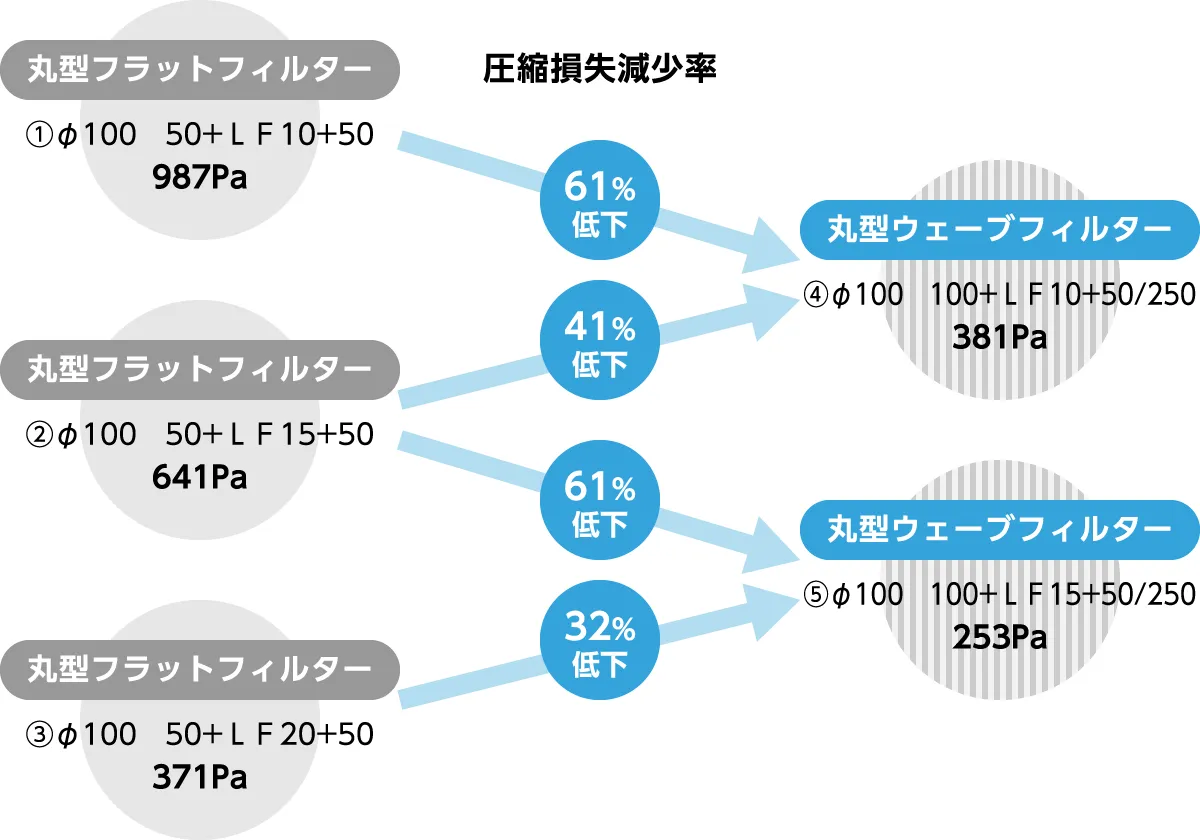 | 圧力損失低下 | ▲63% | ▲62% | ▲60% | ▲60% |
